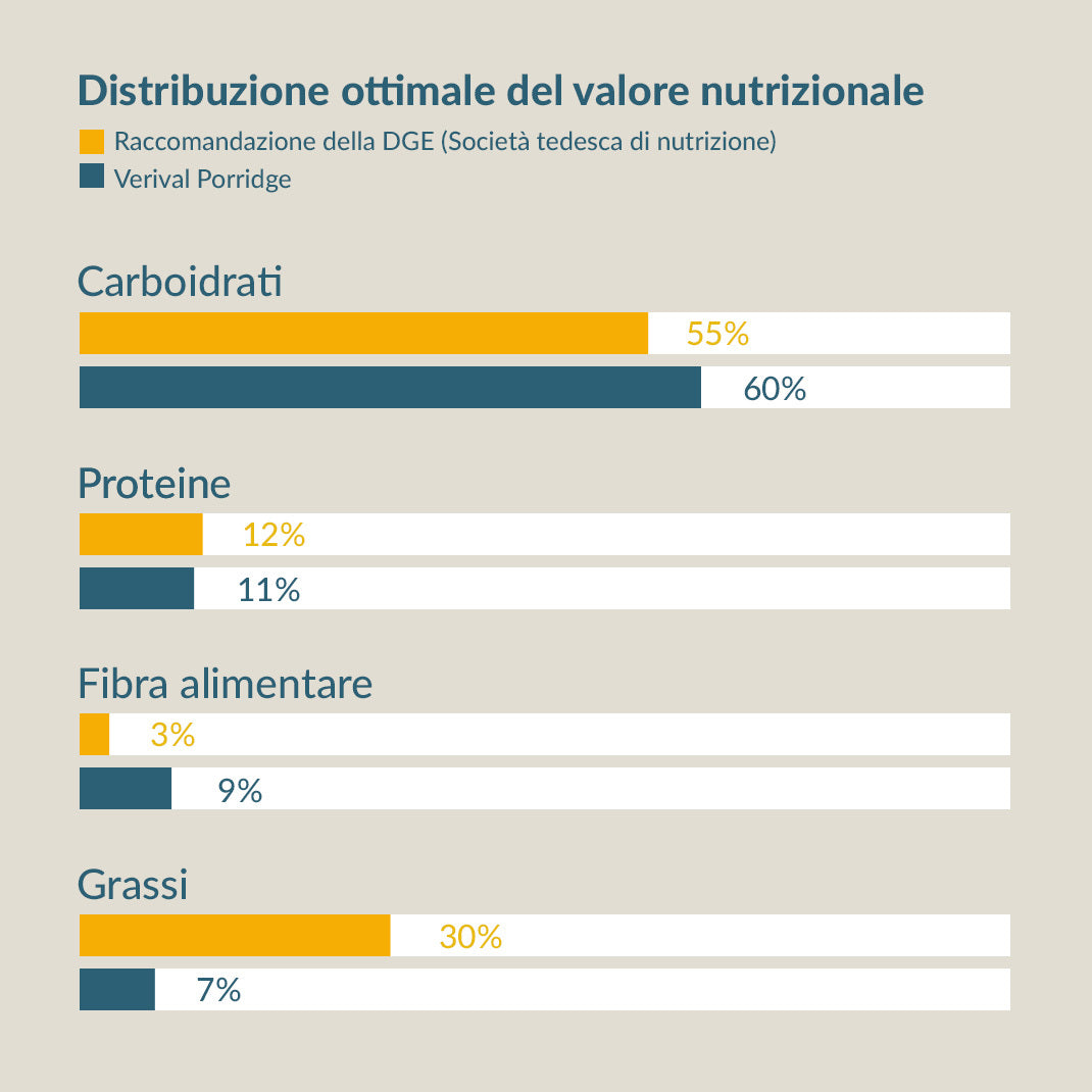 I cereali, le noci e i semi costituiscono la base dei nostri porridge, delle granole e dei mueslis. Si tratta di importanti fonti proteiche di origine vegetale, che svolgono un ruolo particolarmente importante in una dieta vegana. L'avena del nostro Porridge Verival ti fornisce un apporto ottimale di proteine, che ti aiutano a costruire i muscoli e ti mantengono sazio a lungo. Con una porzione di porridge al mattino, assumi già il 20-25% del tuo fabbisogno proteico giornaliero.