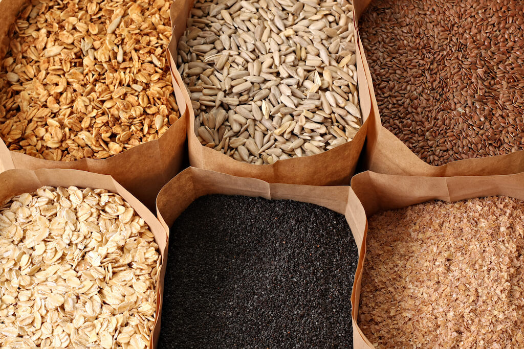 - Wholegrain products – wholegrain flour, wholegrain bread, wholegrain pasta, cereal flakes, oats