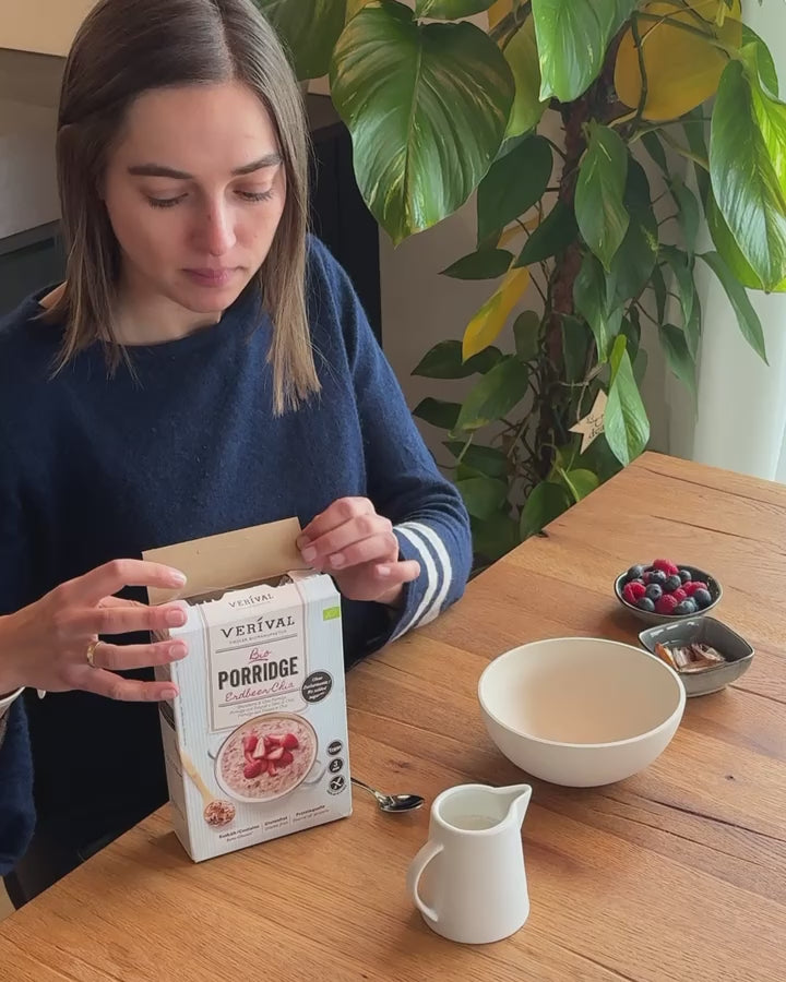 A warm and fibre-rich breakfast is easy to digest and good for your immune system. The complex carbohydrates in wholemeal oats cause your blood sugar to rise slowly, keeping you full longer and preventing cravings! The porridge is also a great source of plant-based proteins, giving your muscles the energy they need. Thanks to the natural sweetness of strawberries and other fruits, no additional sugar is needed, giving you an all-round delicious, low-calorie breakfast. By the way, the porridge is prepared in just 3 minutes, without any cooking.