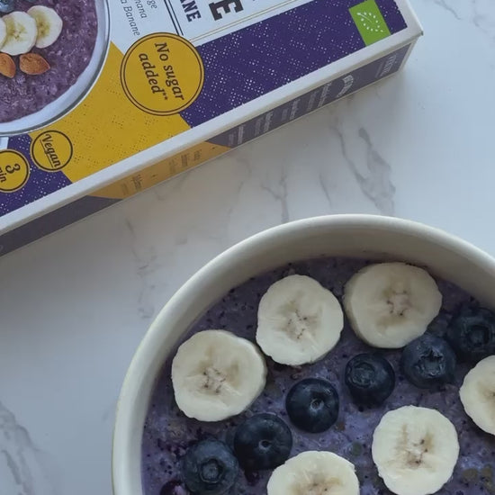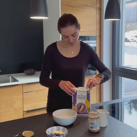 Our gluten-free high protein porridge consists of a mix of bananas, freeze-dried blueberries, hemp seeds, sunflower protein powder and soya flakes from Austria. The protein porridge can be prepared in just three minutes and provides an optimum energy supply in the morning and especially before exercise. The high protein and fibre content gives you plenty of strength and energy. Oatmeal is broken down slowly by the body, so it provides the best long-term energy supply during your sporting activity.