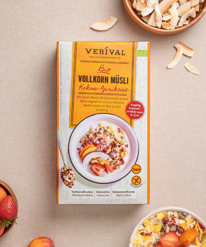Opposites attract, as everyone knows. This is certainly true of our local apricots and tropical coconuts, which give our gluten-free Coconut Apricot Muesli a pleasant sweetness and an exotic touch. Oat flakes, Crunchy, cornflakes, sultanas, sunflower seeds, almonds and forest berries complete the muesli.