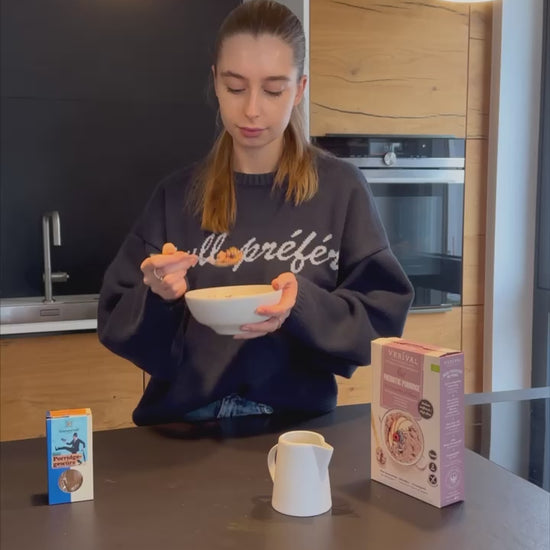 For the basic recipe, pour 50 g (6 tbsp) of the mixture into a bowl with approx. 110 ml (depending on how runny you like it) of hot milk or a plant-based alternative, stir, leave to swell for 3 minutes and enjoy warm.