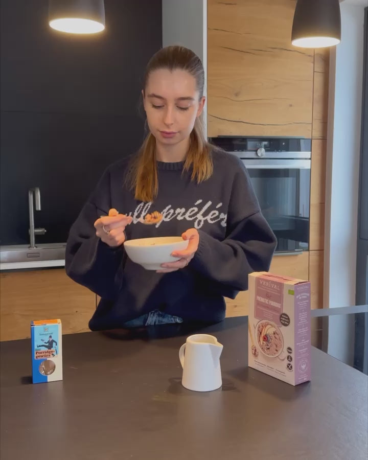 A warm and fibre-rich breakfast is easy to digest and good for your immune system. The complex carbohydrates in wholemeal oats cause your blood sugar to rise only slowly, you stay full longer and cravings don't stand a chance! The porridge is also a great source of vegetable proteins and provides your muscles with the energy they need. The prebiotic fibres from chicory inulin and Jerusalem artichoke serve as food for the beneficial intestinal bacteria and have a positive effect on the composition and activity of the intestinal bacteria. They also prevent constipation and boost your digestion. Thanks to the natural sweetness of raspberries and other fruits, no added sugar is needed, giving you an all-round delicious, low-calorie breakfast. By the way, the porridge is prepared in just 3 minutes, without any cooking.