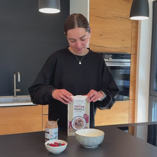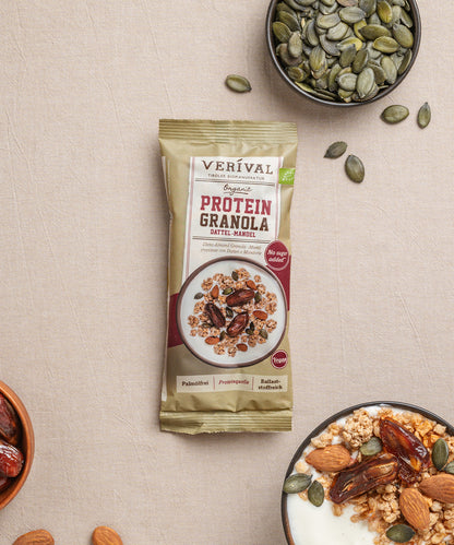 Are you looking for a granola with no added sugar? Then our protein granola with dates and almonds is the solution for you! The Verival protein granola is made without any industrial sugar and is only sweetened by dates and slightly sweet almonds. The flavour of wholegrain oat flakes is perfectly rounded off by a high-quality mix of crunchy sunflower seeds, almonds, pumpkin seeds and coconut flakes and the natural fruity sweetness of dates. Enjoy!