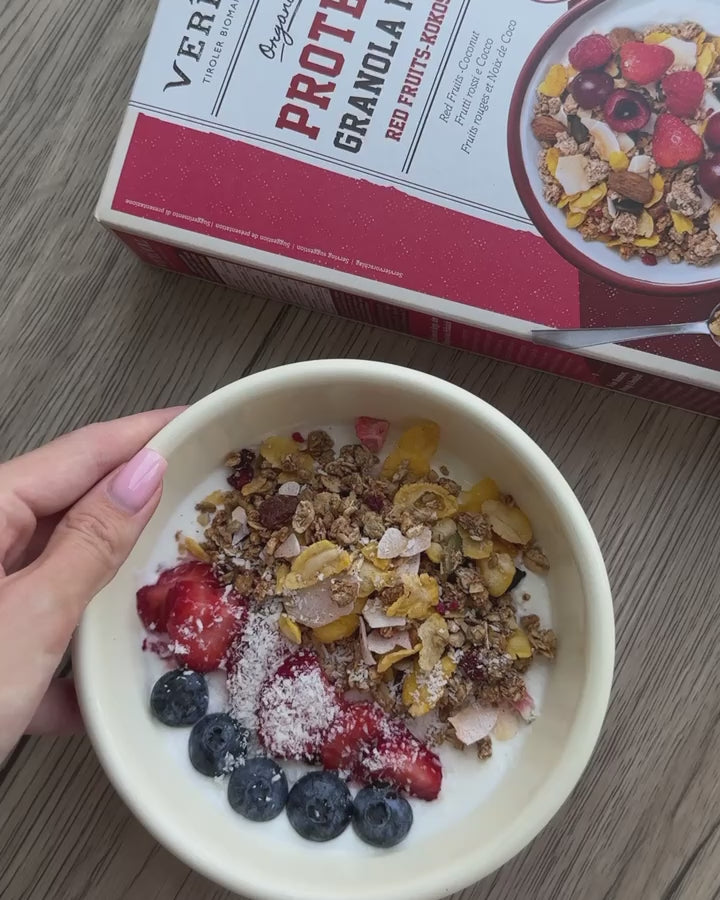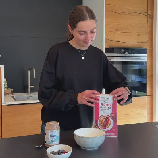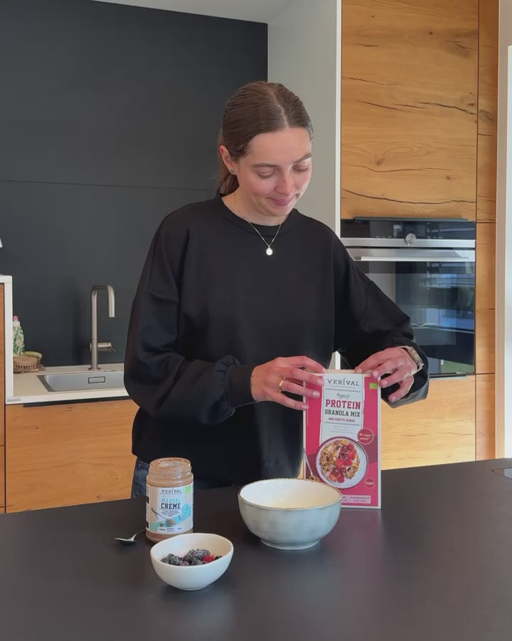 Are you looking for the perfect mix of cereals and granola? Then our Protein Granola Mix Red Fruits-Coconut is the right choice for you! The Verival Protein Granola combines crunchy cereals and granola with a mix of coconut, nuts and fruit and is made without any added sugar, sweetened only by dates and the slightly sweet almonds and fruit. The granola mix is also rich in plant-based proteins, helping you to build muscle.