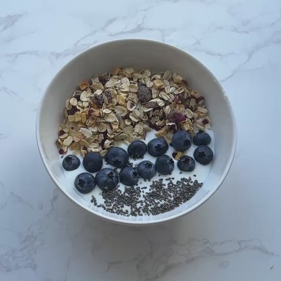 La combinaison des deux fruits, cranberry et cerise douce, mélangée à des flocons d'avoine, des raisins secs, des cubes de pomme et des graines de tournesol, adoucira ton début de journée chaque jour. Un petit déjeuner léger, mais qui rassasie longtemps !