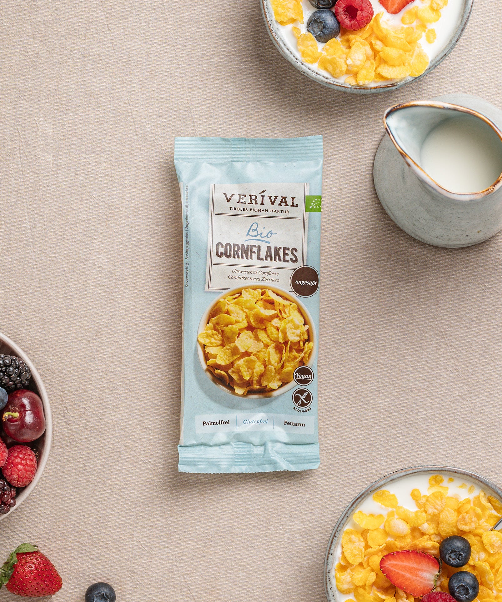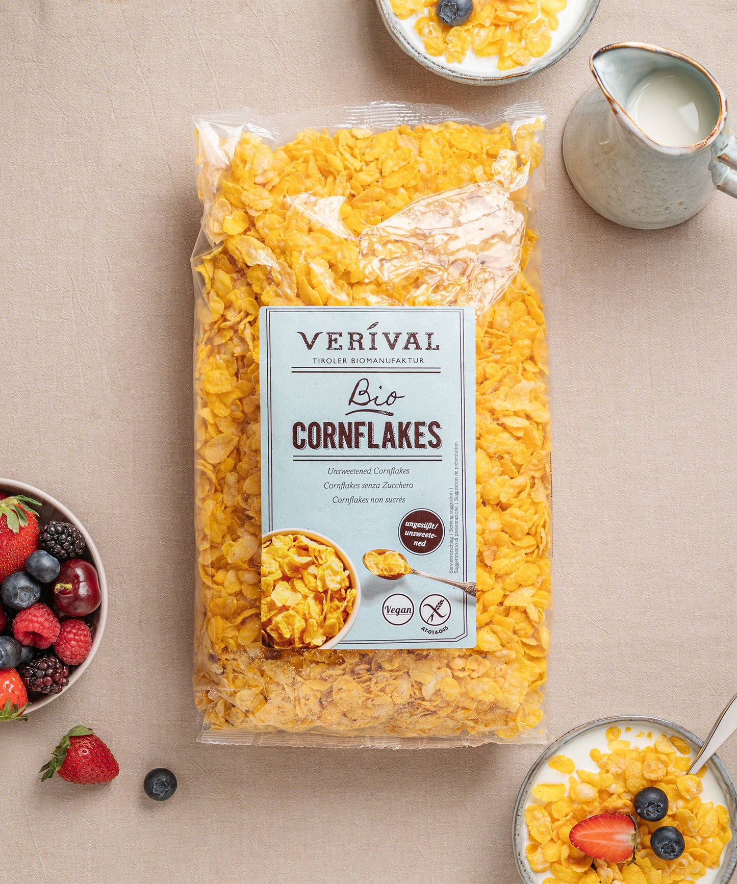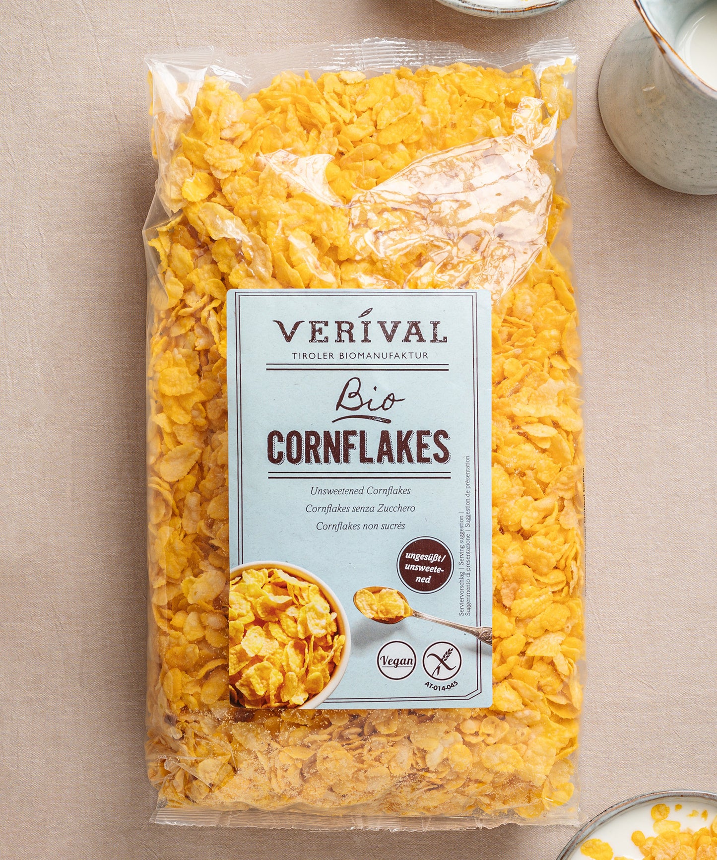 Pour tous ceux qui ont envie d'un petit déjeuner croustillant le matin, nos cornflakes bio sont exactement ce qu'il leur faut. Fabriqués selon l'art culinaire traditionnel, soigneusement séchés, laminés en tendres flocons et délicatement grillés, nos cornflakes révèlent leur plein et incomparable arôme.