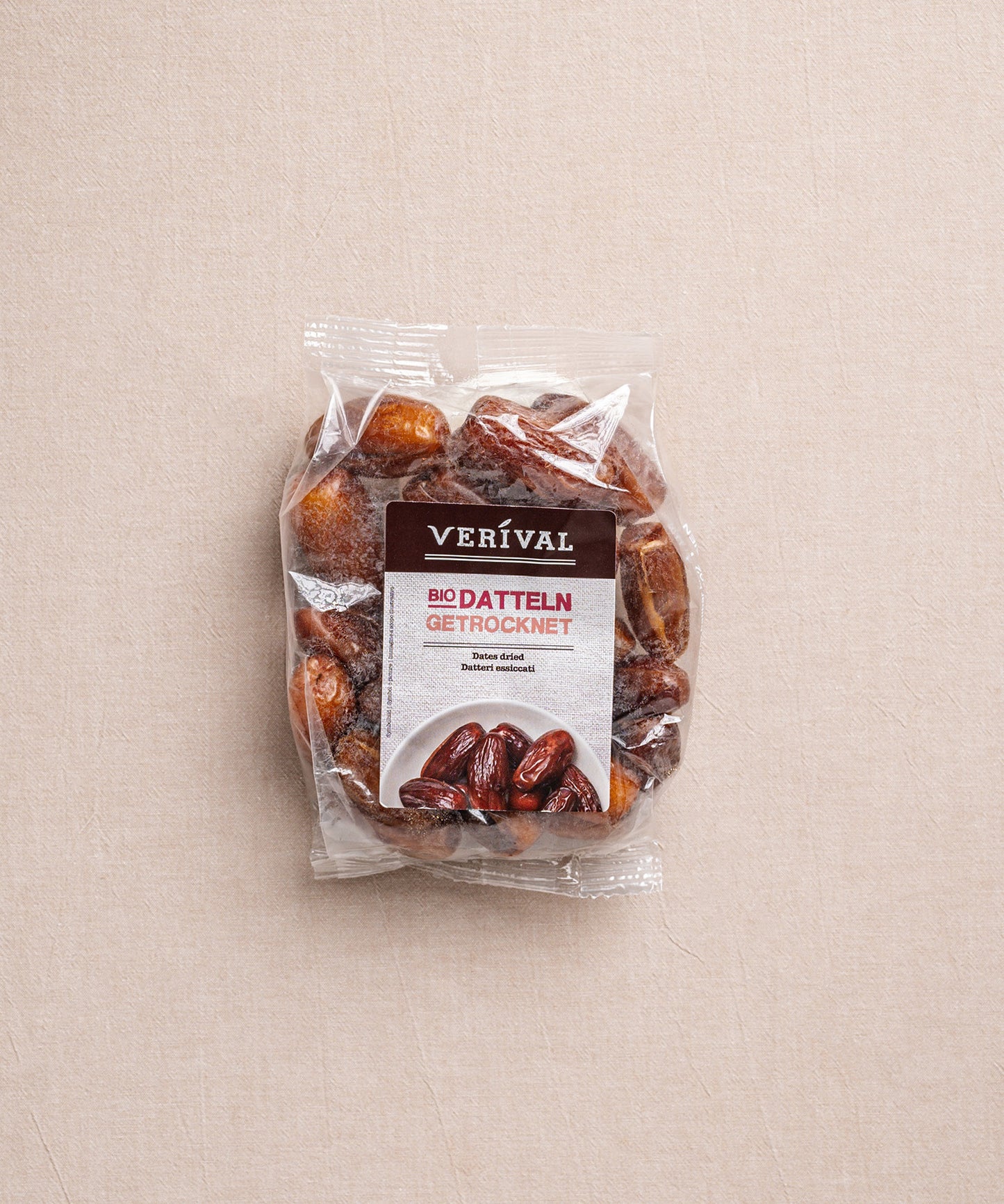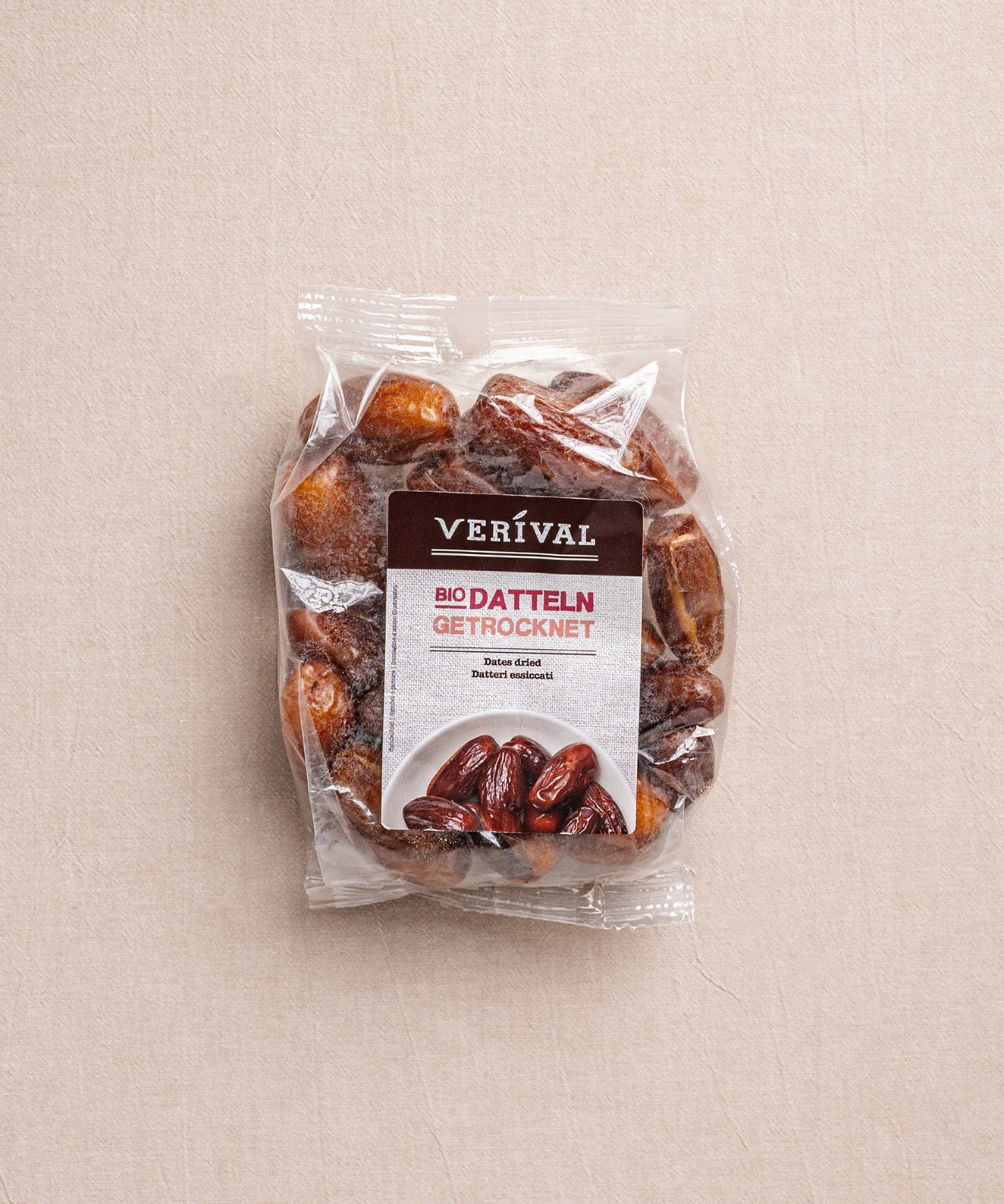 100% dates séchées issues de l‘agriculture biologique contrôlée.