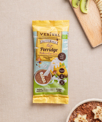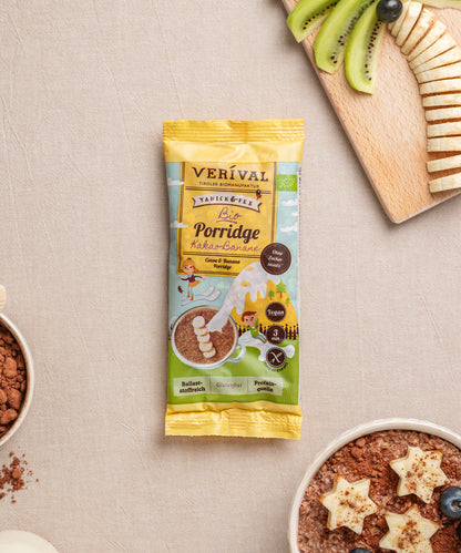 Tu cherches un petit déjeuner idéal et équilibré pour les enfants, sans sucre ? Notre porridge sans gluten pour enfants à base de flocons d'avoine complets ne contient pas de sucre ajouté, mais les bananes et les dattes lui confèrent une douceur naturelle adaptée aux enfants. De plus, il est agrémenté d'un délicieux cacao. Le petit déjeuner chaud est préparé en trois minutes seulement et sa teneur élevée en protéines et en fibres garantit un apport optimal en nutriments le matin. Pour une sensation chaude et agréable dans le ventre & un début de journée plein d'énergie pour les enfants !