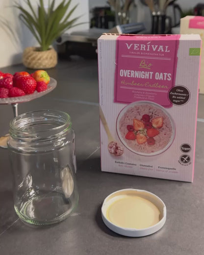 L'overnight oats fornisce al tuo corpo tutti i nutrienti importanti per la colazione, è facile da digerire e fa bene al tuo sistema immunitario. I carboidrati complessi dell'avena integrale fanno sì che la glicemia aumenti lentamente, mantenendoti sazio più a lungo e prevenendo le voglie. L'avena integrale garantisce inoltre una sana digestione grazie alle fibre che contiene. Le fragole e i lamponi contengono inoltre importanti vitamine e minerali.