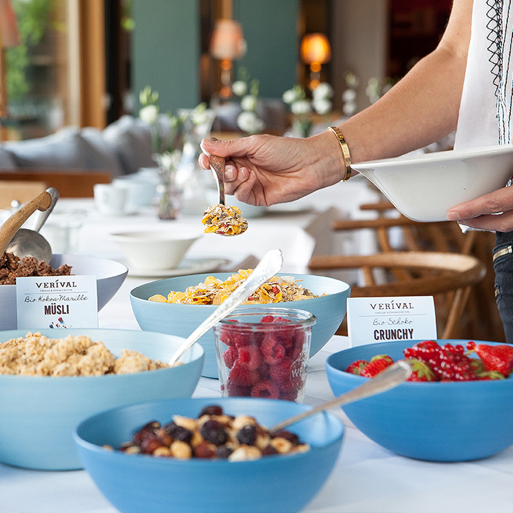 "Da sich das Gesundheitsbewusstsein und Qualitätsdenken der Menschen im Laufe der letzten Jahre merklich verändert hat, ist der Konsum vonMüsliprodukten stark gestiegen. Unsere Gäste schätzen es deshalb jeden Morgen sehr, wenn Sie aus mehr als 15 verschiedenen Sorten ihr gesundesFrühstück zusammenstellen können. Vor allem geht Verival mit der Zeit, und deckt auch viele Nahrungsunverträglichkeiten sowie Trends der Ernährung ab."