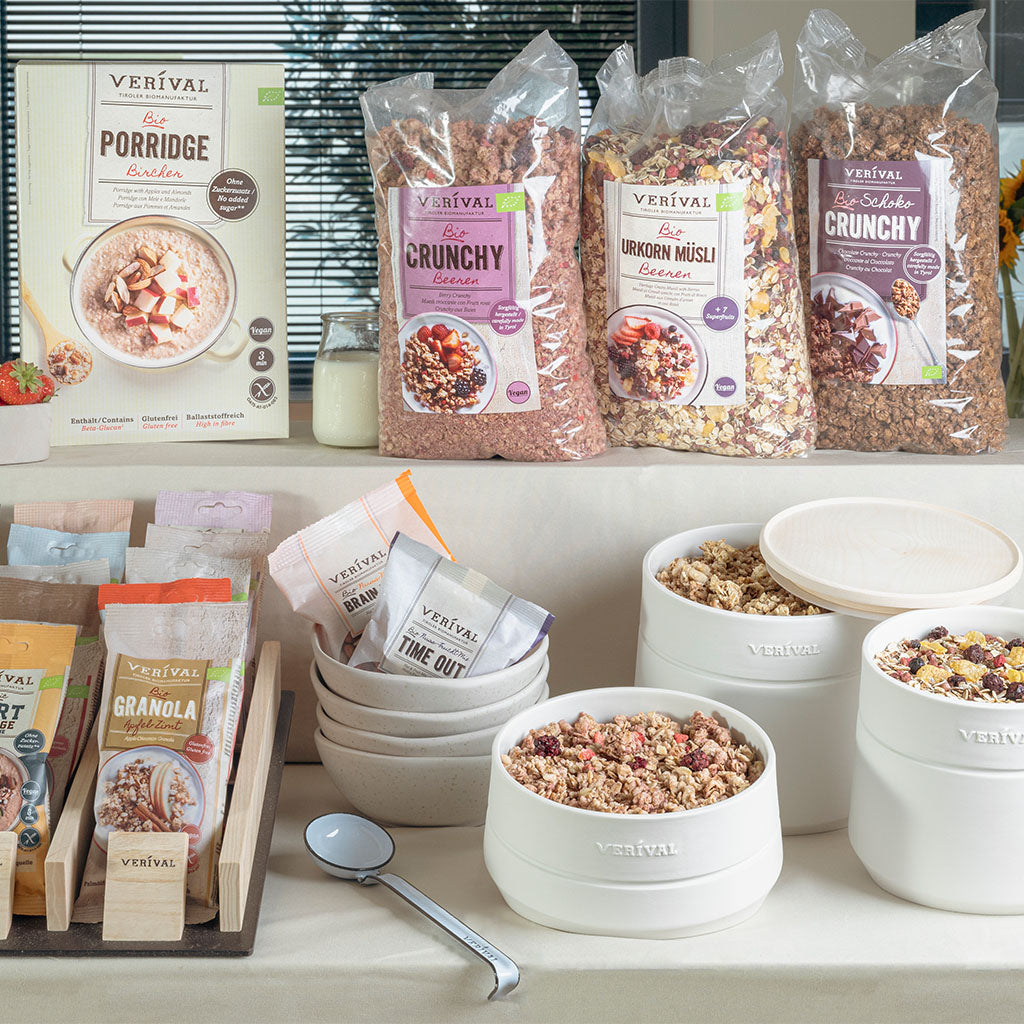 Bei VERIVAL finden Sie eine große Auswahl an Porridges, Granolas, Müslis, Cerealien, Kinder Frühstück sowie Sport Frühstück für Ihr Frühstücksbuffet. Unsere Produkte sind sowohl als hygienische Einzelportionen, als auch als praktische Großpackungen erhältlich.
