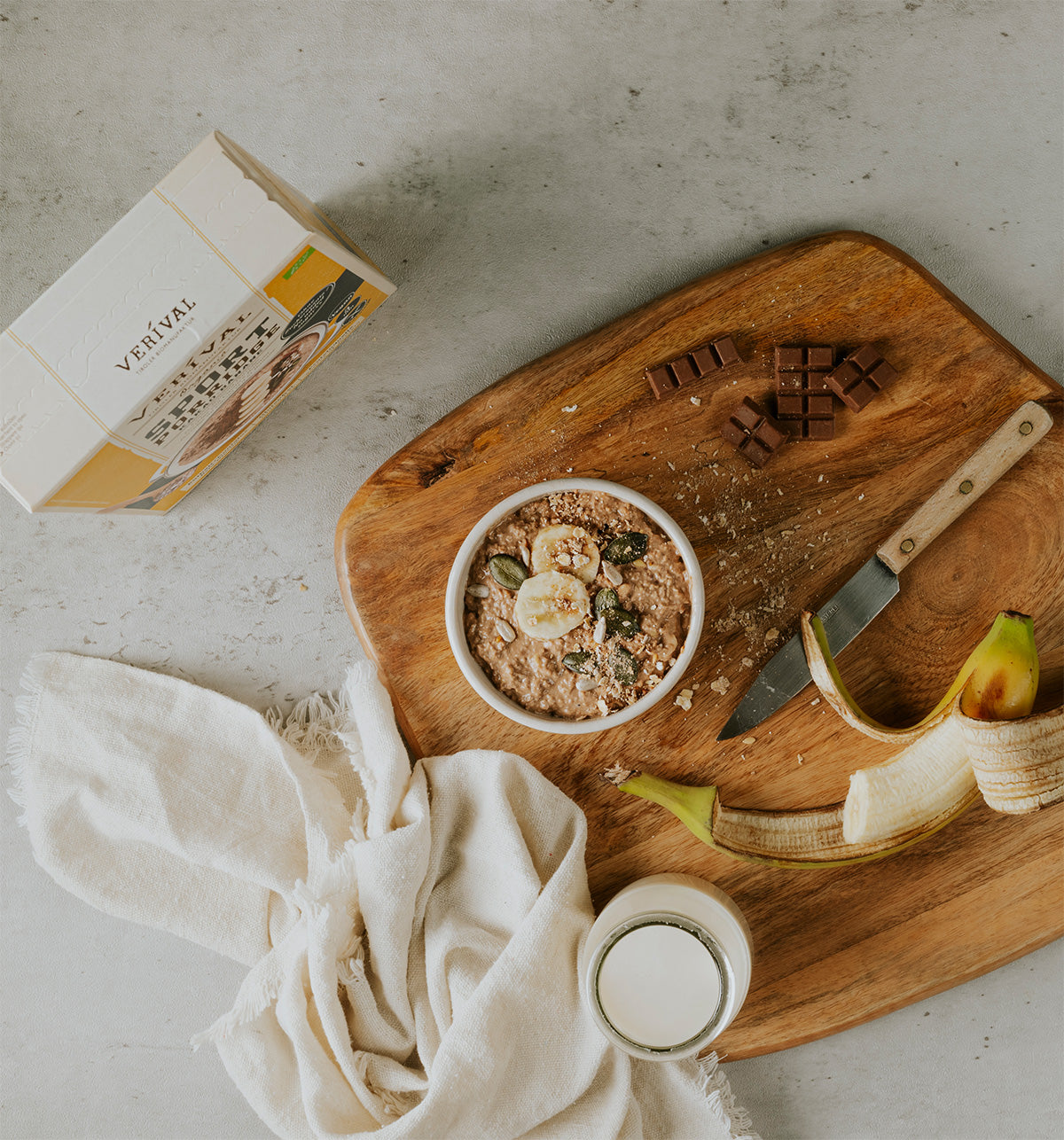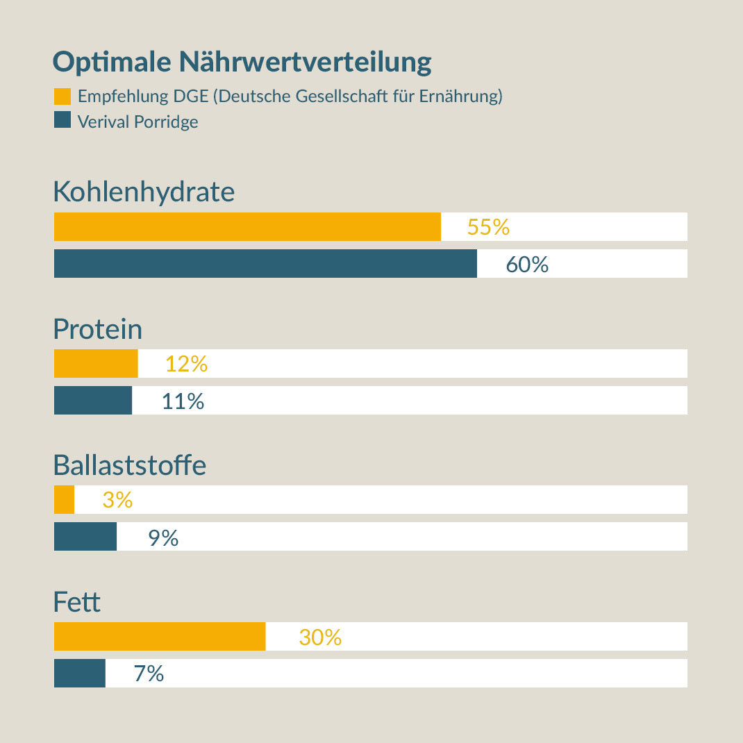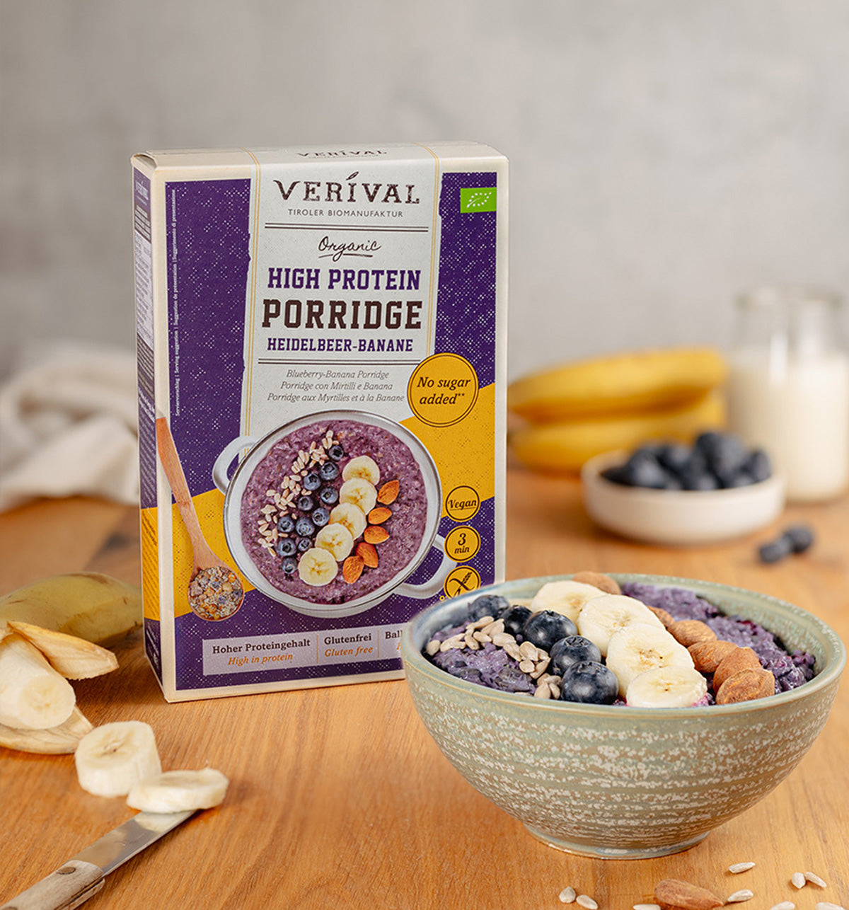 Die Basis für unsere Porridges, Granolas und Müslis bilden Getreide, Nüsse und Samen. Diese sind wichtige pflanzliche Proteinquellen, die vor allem bei einer veganen Ernährung eine große Rolle spielen. Der Hafer in unserem Verival Porridge versorgt dich optimal mit Einweiß, das dir dabei hilft Muskeln aufzubauen und dich auch lange sättigen. Mit einer Portion Porridge in der Früh nimmst du bereits 20-25% deines täglichen Proteinbedarfs zu dir.