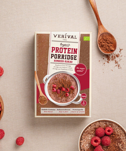 Unser Sport Protein Porridge Himbeer-Kakao besteht aus Haferkleie, Datteln, Kakaopulver, Himbeeren sowie Sonnenblumen- und Kürbiskernproteinpulver. Das Protein Porridge ist in nur drei Minuten zubereitet und sorgt für eine optimale Energieversorgung am Morgen und vor allem vor dem Sport.